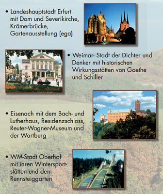 Entdecken und erleben Sie, was unsere Region zu bieten hat. Ob Wanderfreunde oder Sportbegeisterte, genauso wie Städtebummler und Kulturbegeisterte - sicher ist für jeden Geschmack etwas dabei. Unsere Pension liegt mitten im grünen Herzen Deutschlands und ist nur 3 km vom Stadtkern Arnstadts, der ältesten Stadt Thüringens, entfernt. Selbst zu Fuß oder mit dem Rad können Sie von uns aus in nur kurzer Zeit die Stadt erkunden und den Spuren von Johann Sebastian Bach nachgehen. Arnstadt gilt auch als das Tor zum Thüringer Wald! Sie erreichen den Rennsteig in ca. 25 Autominuten (Oberhof). Bei zahlreichen Wanderwegen und Ausflugszielen, sowie Sportmöglichkeiten, ist sicher für jeden Naturfreund etwas dabei. Die drei Burgen im Gleichgebiet - Schloss Gleichen, Mühlburg und Wachsenburg - sind in einer halben Stunde Autofahrt zu erreichen. In der weiteren Umgebung (ca. 50 km) finden Sie die Städte Eisenach, Gotha, Erfurt, Weimar und Jena. | ||